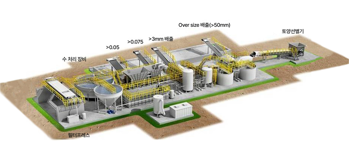 - 오염된 토양을 세척제와 기계적 마찰을 이용하여 오염물질을 토양입자로부터 탈착시킨 후 액상으로 분리시키는 기술